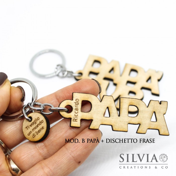 Ho realizzato due modelli di portachiavi in legno, uno con sagoma PAPA' TVB e l'altro con sagoma PAPA' e dischetto con frase incisa. E' possibile personalizzare il portachiavi incidendo i nomi dei figli all'interno della sagoma (nella foto d'esempio ho scritto Riccardo).