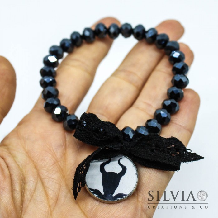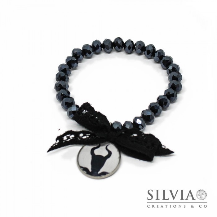 Bracciale elastico con cristalli neri da 8x6 mm e ciondolo Malefica inspired
