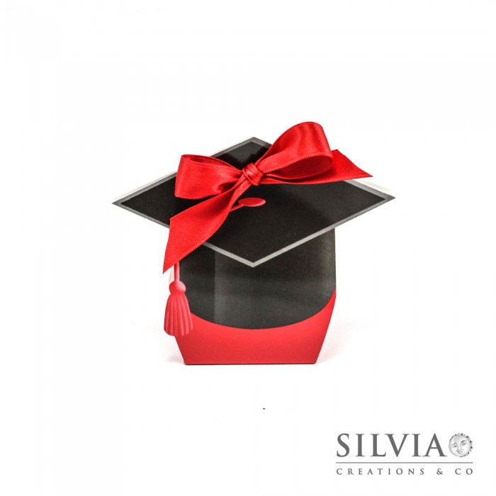 Scatola a forma di tocco (cappello laurea) portaconfetti o porta bomboniera in cartoncino color rosso e nero. Questa scatola è indicata per confezionare le bomboniere per il festeggiamento della laurea.