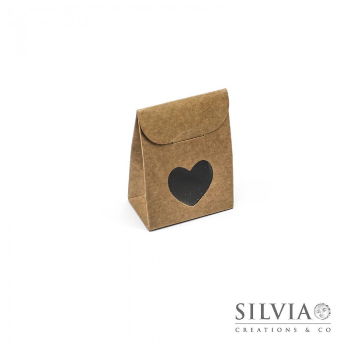 Scatola a forma di sacchetto con finestra a cuore portaconfetti o porta bomboniera in cartoncino color avana. Questa scatola è indicata per confezionare bomboniere oppure può essere messa a disposizione dei propri invitati durante la confettata di nozze.