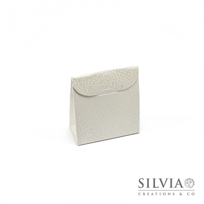 Scatola a forma di sacchetto portaconfetti o porta bomboniera in cartoncino effetto pelle bianca. Questa scatola è indicata per confezionare bomboniere oppure può essere messa a disposizione dei propri invitati durante la confettata di nozze.