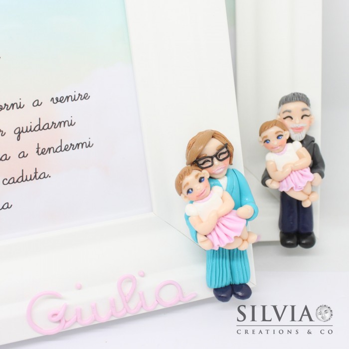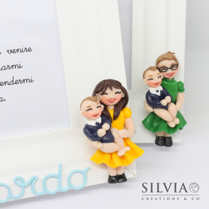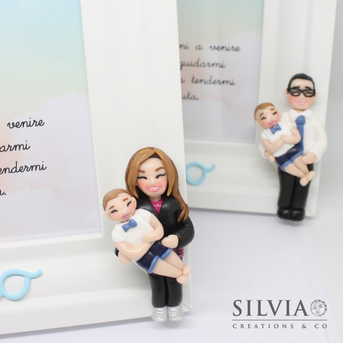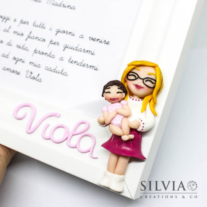 La cornice è decorata con il nome della bambina o bambino e ho realizzato la miniatura personalizzata della madrina, del padrino, della mamma o del papà e del bebè.