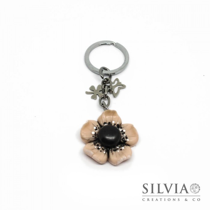 Portachiavi fiore anemone rosa cipria e nero con charms