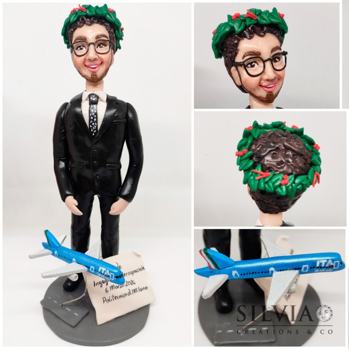 Ho realizzato questo soggetto modellandolo interamente a mano con pasta sintetica fimo come cake topper per la laurea di Davide. Ai suoi piedi ho posizionato una targhetta con indicato nome e titolo della laurea e la miniaturadi un aereo.