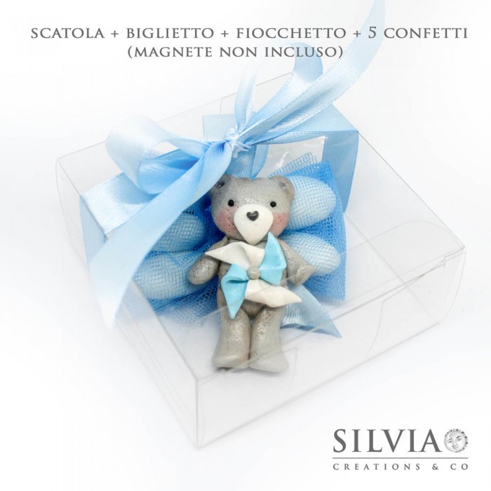 Confezione completa comprensiva di astuccio (scatola) portaconfetti in pvc trasparente, bigliettino con il nome del festeggiato e la data dell'evento, cinque confetti alla mandorla e fiocco di raso alto 15 mm del colore desiderato. Questa scatola è indicata per confezionare le bomboniere per il festeggiamento di matrimoni, anniversari di nozze, battesimi, comunioni, cresime.