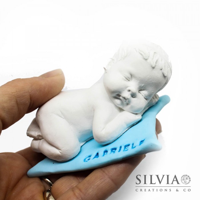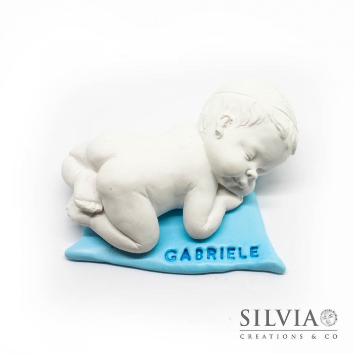 Gessetto a forma di bambino che dorme su copertina realizzata in pasta sintetica fimo azzurra con inciso il nome del vostro bambino. Le dimensioni del bambino sono 9 cm di lunghezza, 3,5cm di altezza e 4 cm di profondità. Questa creazione può essere utilizzata come bomboniera per il battesimo del vostro bambino. Viene utilizzato anche come idea regalo e può essere profumato con le essenze che preferite ed essere utilizzato come profuma cassetti.
