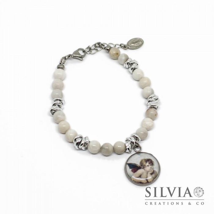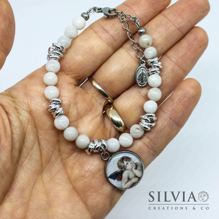 Bracciale perle di agata bianca con ciondolo angelo di Raffaello