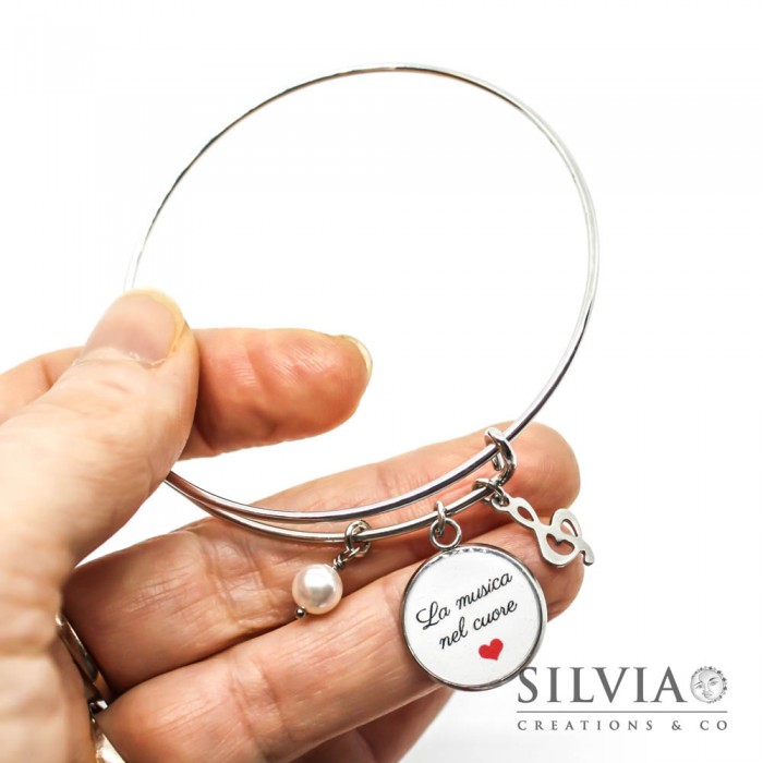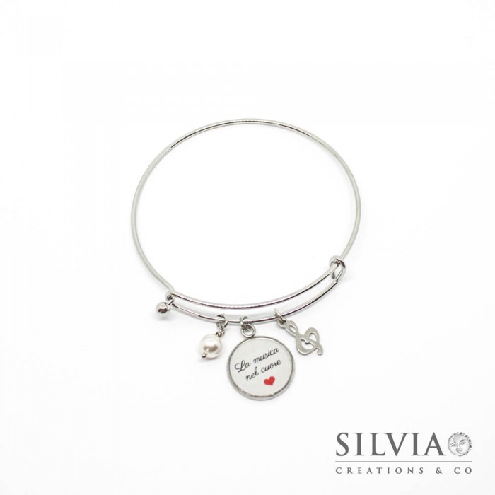 Bracciale bangle in acciaio con frase "La musica nel cuore"