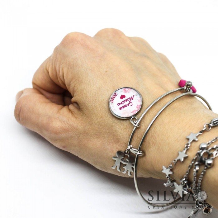 Ho creato questo bracciale con una base bangle in acciaio da 6 cm di diametro con apertura a scorrimento. Nel braccialetto ho fissato un ciondolo principale costituito da una base cabochon rotonda contenente un'immagine con la scritta "Grazie Maestra" circondata da una corona di fiori nella quale ho indicato anche l'anno 2020 (se preferite non indicare l'anno contattatemi). Questo soggetto è stato realizzato con la tecnica della resina colata. Questa tecnica consiste nella colatura di uno strato di resina all’interno di un cabochon che rende impermeabile e incorruttibile il suo contenuto. Il cabochon che ho utilizzato è in acciaio e misura 16 mm di diametro.