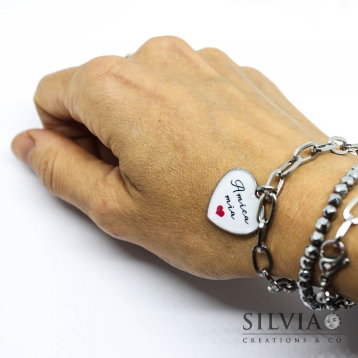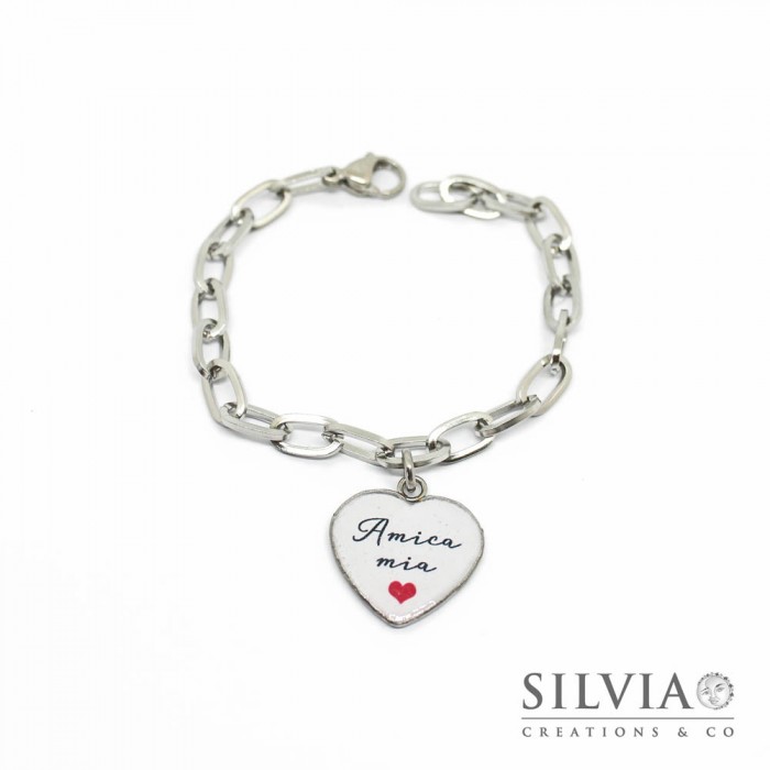 Bracciale catena acciaio e ciondolo a forma di cuore con scritta Amica Mia