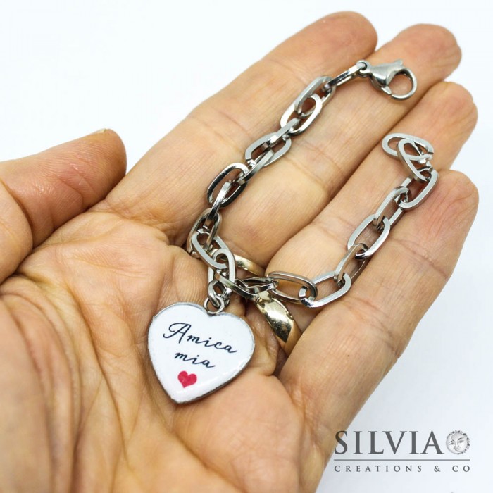 Ho utilizzato come base una catena in acciaio con maglie ovali piatte da 10x6mm. Nel braccialetto ho inserito un ciondolo principale costituito da una base cabochon a forma di cuore contenente un'immagine con la scritta "Amica Mia" con cuore rosso. Questo soggetto è stato realizzato con la tecnica della resina colata. Questa tecnica consiste nella colatura di uno strato di resina all’interno di un cabochon che rende impermeabile e incorruttibile il suo contenuto. Il cabochon che ho utilizzato è in acciaio e misura 2x2 cm.