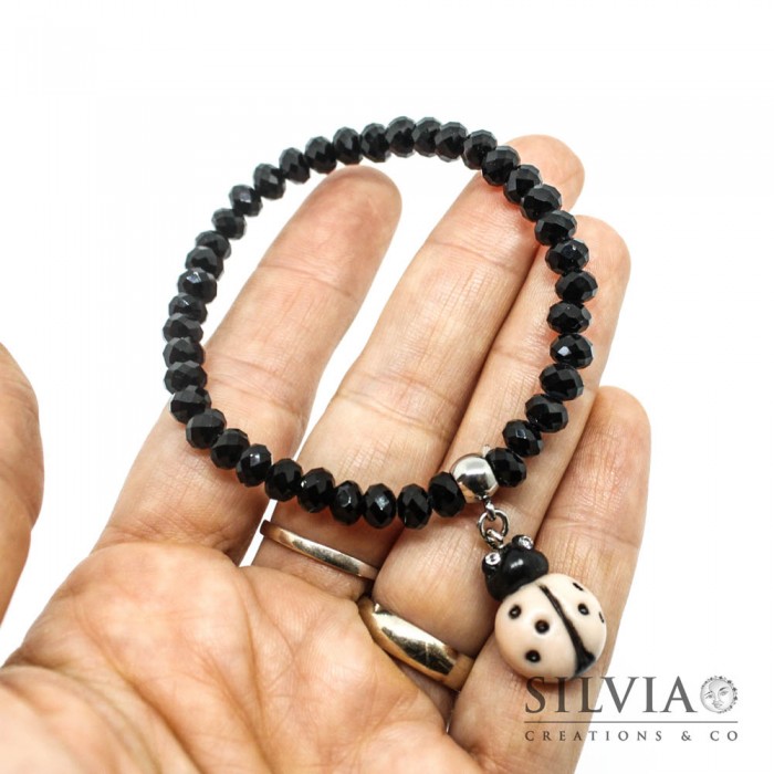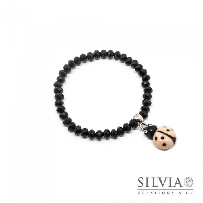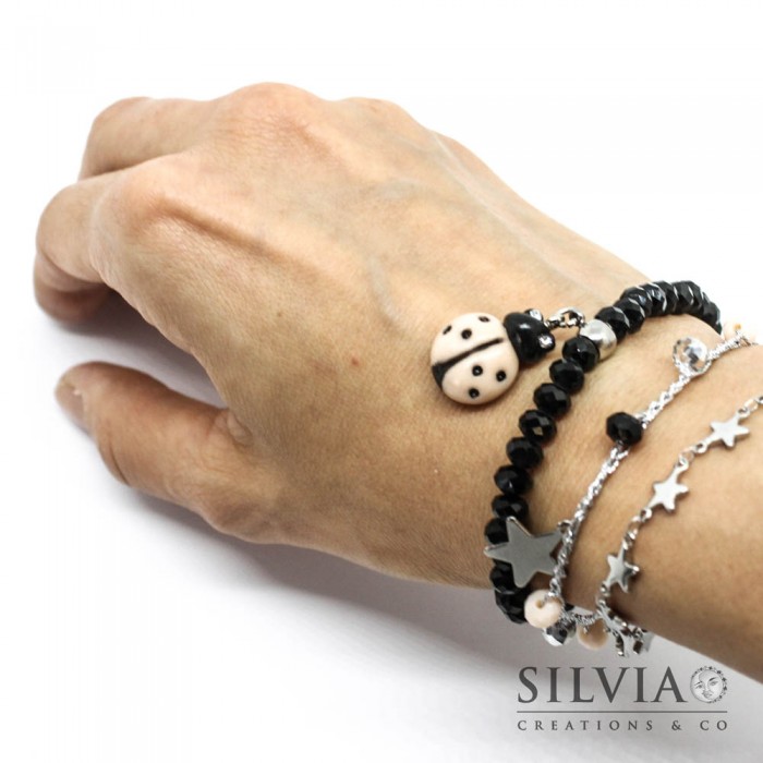 Bracciale elastico con cristalli neri da 4x6 mm e coccinella rosa cipria e nera