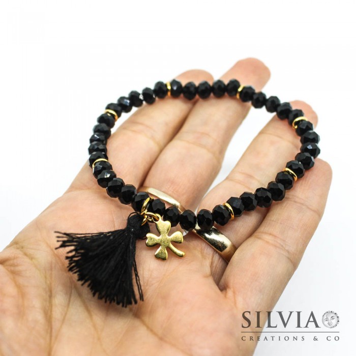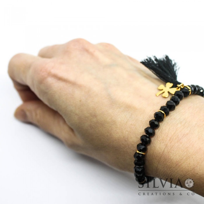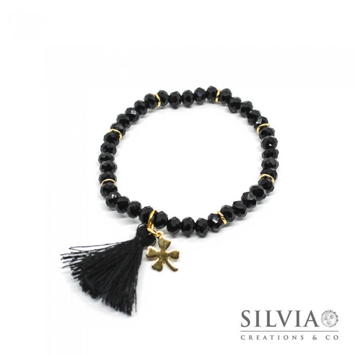 Bracciale elastico cristalli neri da 4x6 mm con nappina e quadrifoglio in acciaio color oro