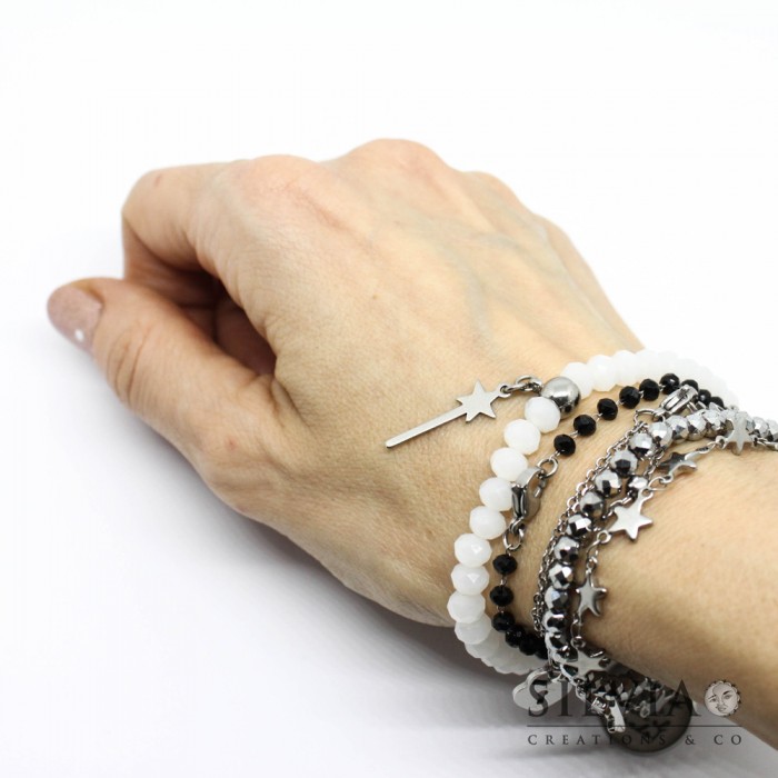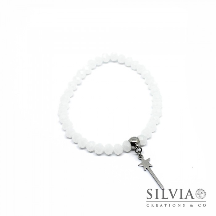 - La base del bracciale è un elastico in cui ho infilato dei cristalli a rondella bianchi da 6x4 mmm. Il ciondolo principale è in acciaio a forma di bacchetta magica e misura 22x8 mm.