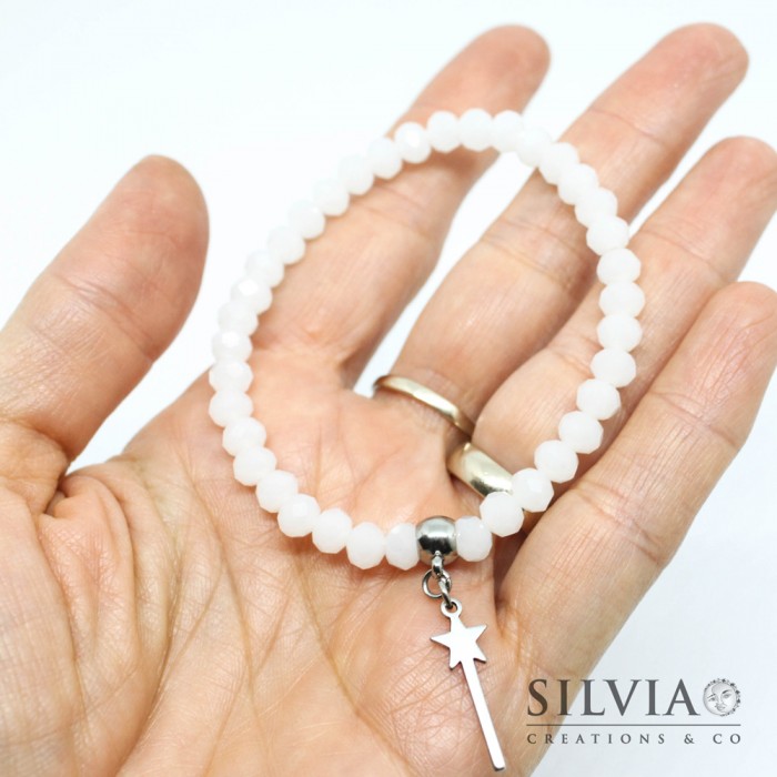 Bracciale elastico con cristalli bianchi e ciondolo a forma di bacchetta magica