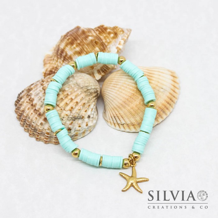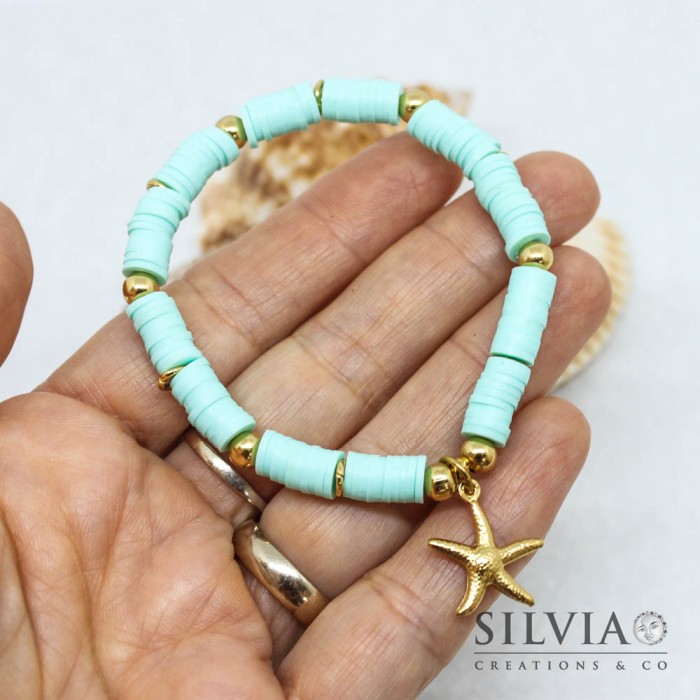 Bracciale elastico con perline heishi azzurro acqua e stella marina oro