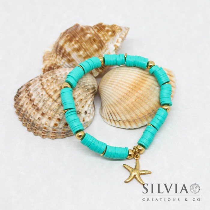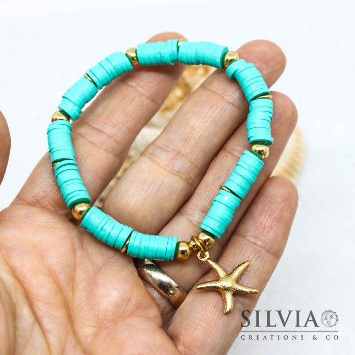 Bracciale elastico con perline heishi azzurro acqua e stella marina oro