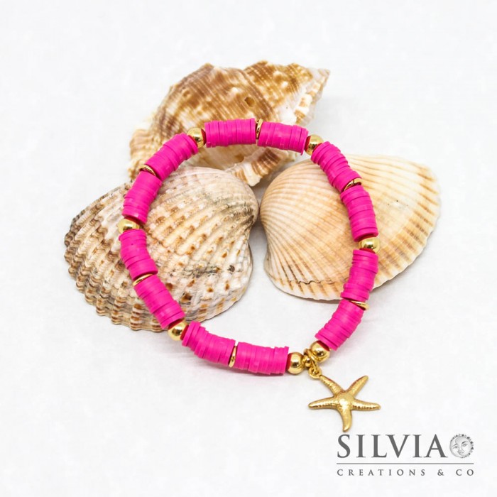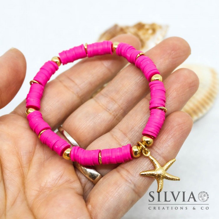 Bracciale elastico con perline heishi fucsia e stella marina oro