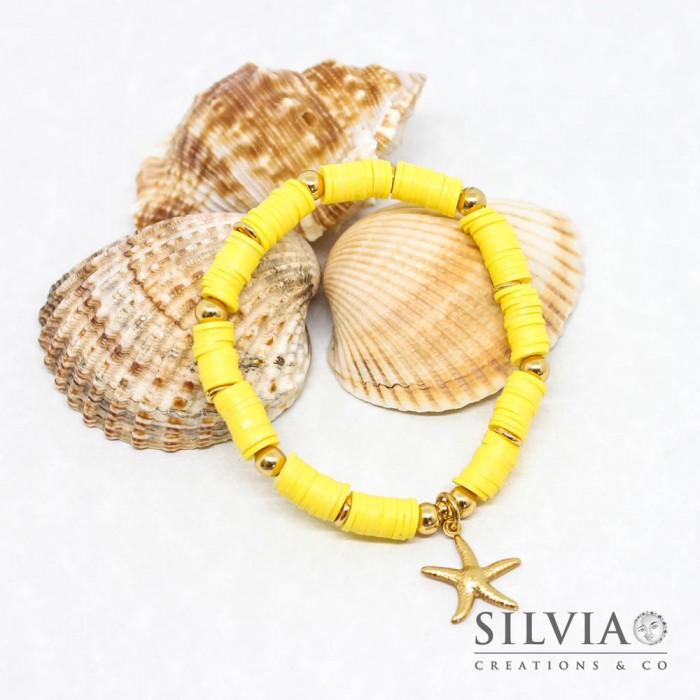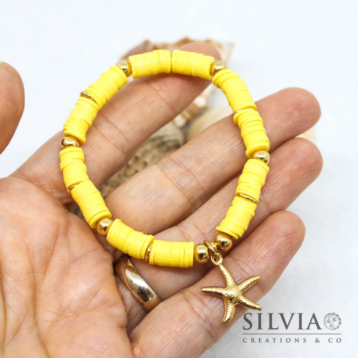 Bracciale elastico con perline heishi gialle e stella marina oro