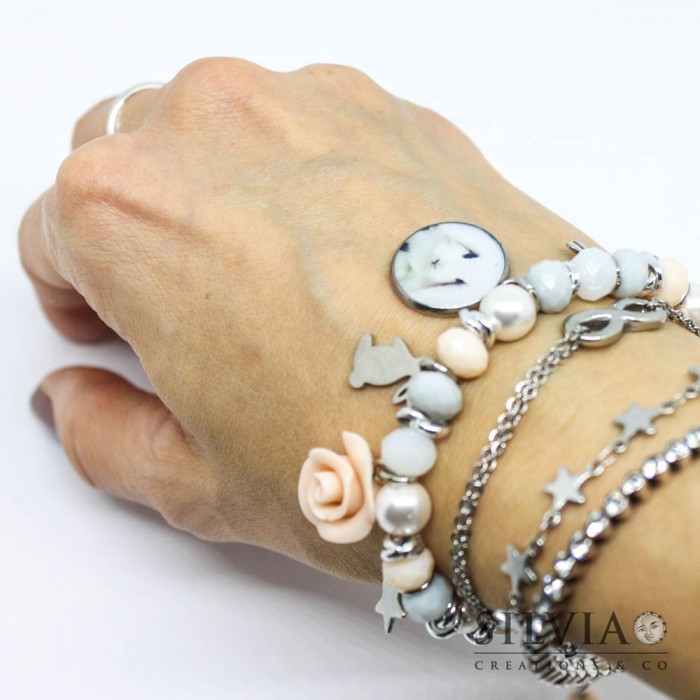Ho realizzato questo bracciale con delle perle da 8 e 6 mm bianche, con cristalli a rondella da 8x6 e 6x4 mm color rosa cipria, grigio e bianco opale, alternati da nodini di anellini in alluminio. Nel braccialetto ho inserito un ciondolo principale costituito da una base cabochon rotonda contenente l'immagine del vostro cucciolo. Questo soggetto è stato realizzato con la tecnica della resina colata. Questa tecnica consiste nella colatura di uno strato di resina all’interno di un cabochon che rende impermeabile e incorruttibile il suo contenuto. Il cabochon che ho utilizzato è in acciaio e misura 16 mm di diametro.