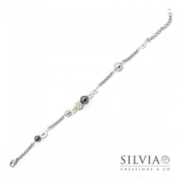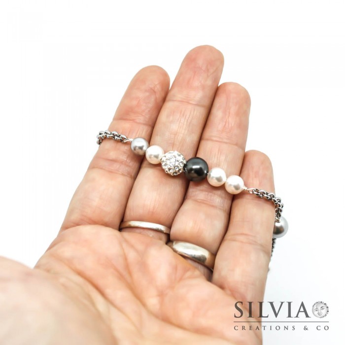 Bracciale con perle Swarovski Elements color bianco e grigio catena acciaio