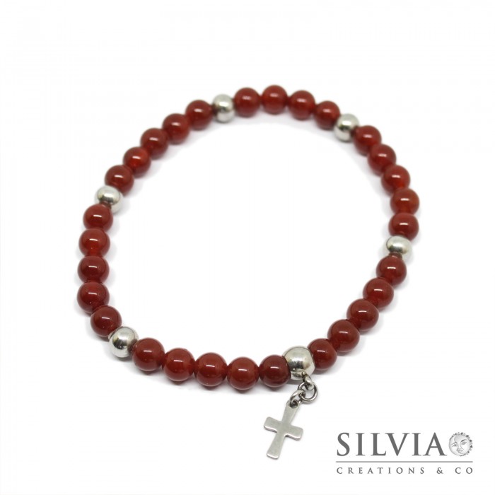 Bracciale uomo con perle di corniola da 6 mm e croce in acciaio