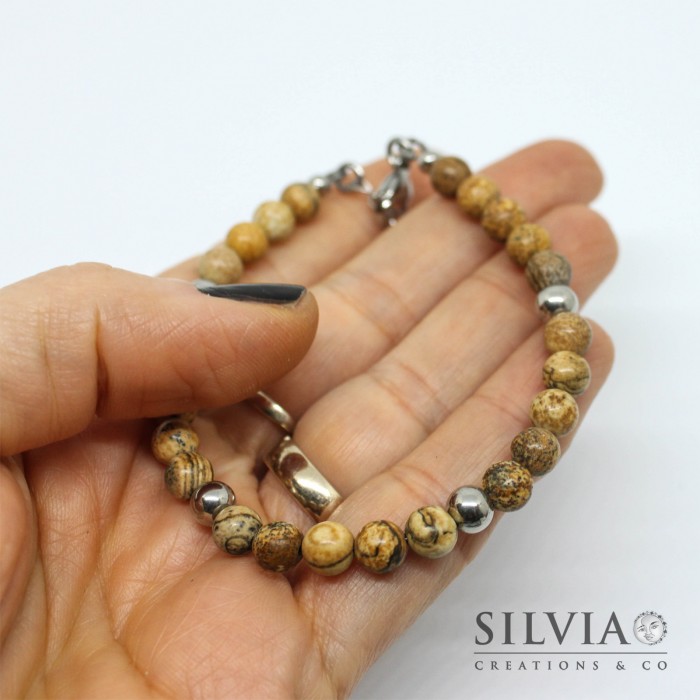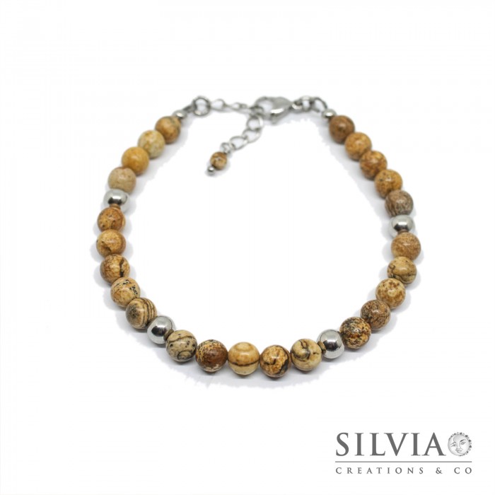 Ho realizzato questo bracciale da uomo con delle perle di diaspro wood da 6 mm, intervallate da perle in acciaio. Il bracciale presenta una chiusura a moschettone anch'essa in acciaio.