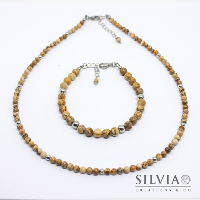 Collana uomo con perle di diaspro wood da 4 mm e perle acciaio