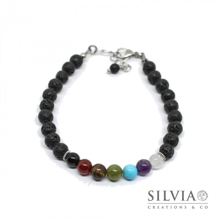 Bracciale uomo con pietre per i sette chakra e perle di pietra lavica da 6mm