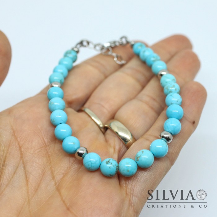 Ho realizzato questo bracciale da uomo con delle perle di turchese da 6 mm, intervallate da perle in acciaio. Il bracciale presenta una chiusura a moschettone anch'essa in acciaio.