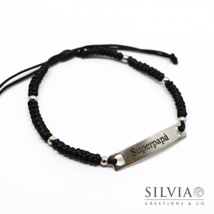 Ho realizzato questo bracciale da uomo con una targhetta su cui ho inciso la scritta "Superpapà", ma la scritta è personalizzabile. La base del bracciale è realizzata con cordino lucido tipo coda di topo, ho eseguito una serie di nodi e li ho alternati apalline oin acciaio. Facendo scorrere i due laccetti è possibile regolare la lunghezza del bracciale.