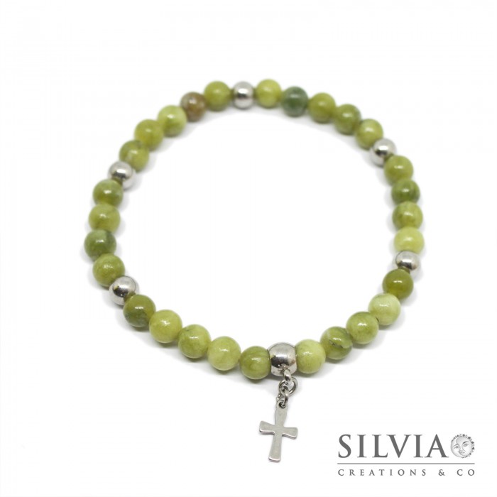 Bracciale uomo con perle di giada verde da 6mm e croce in acciaio