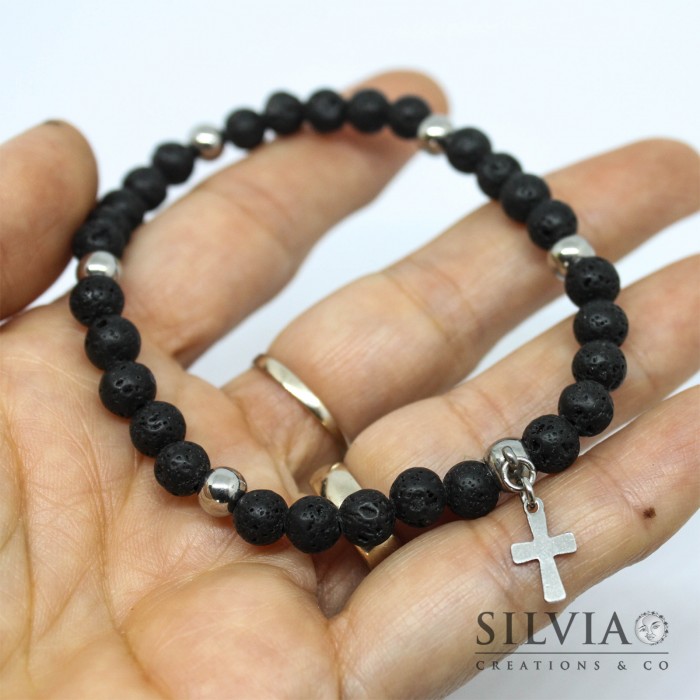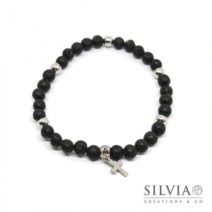 Bracciale uomo con perle di pietra lavica da 6mm e croce in acciaio