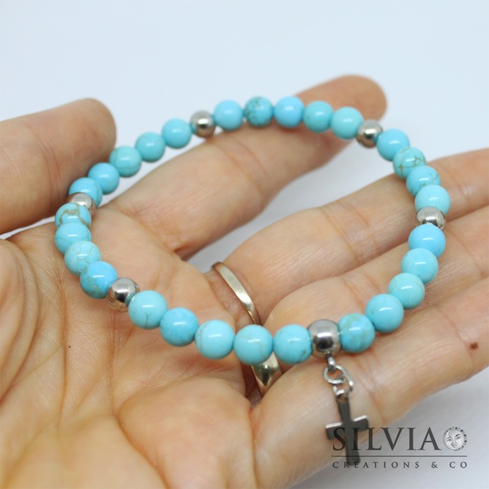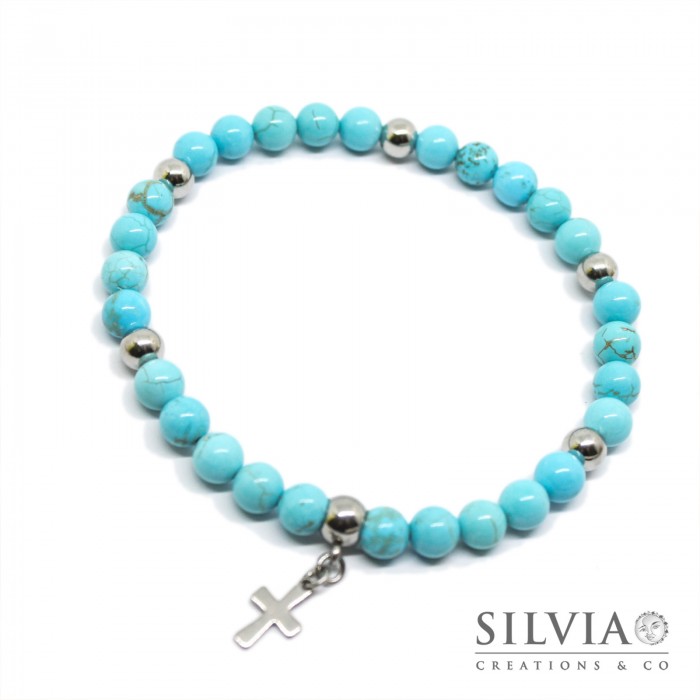 Bracciale uomo con perle di turchese da 6mm e croce in acciaio