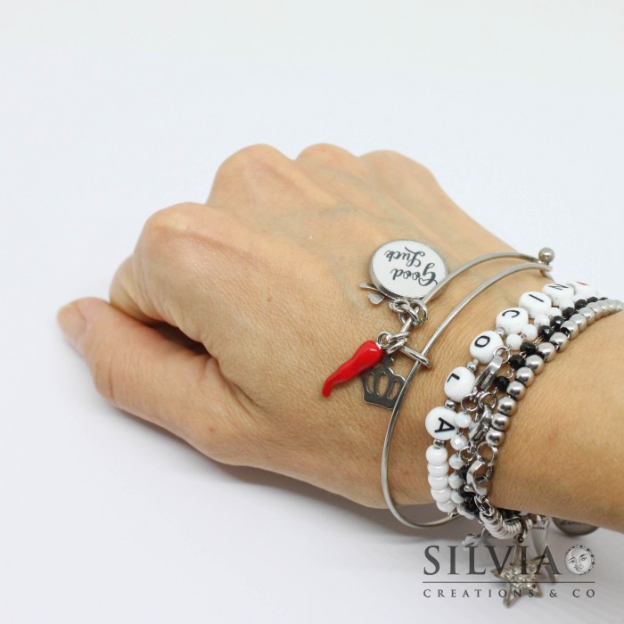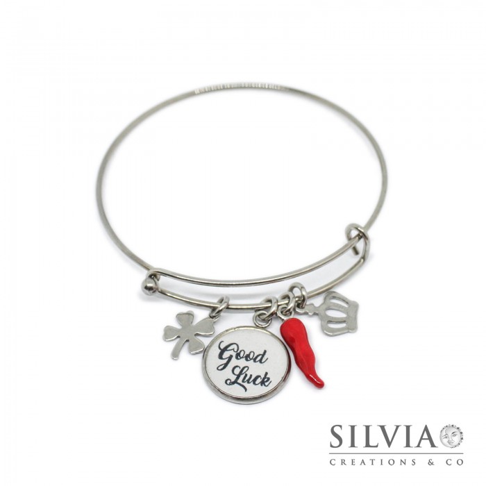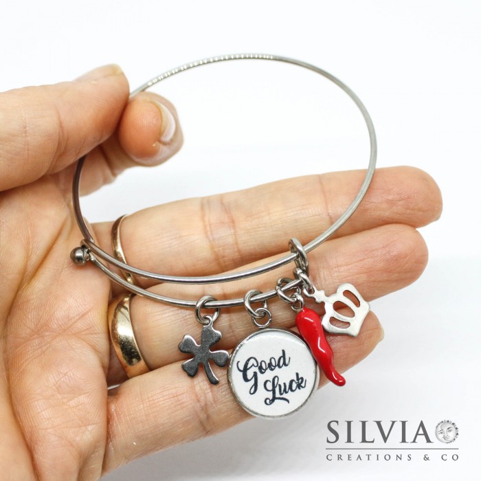Bracciale bangle con ciondolo Good Luck e ciondoli portafortuna