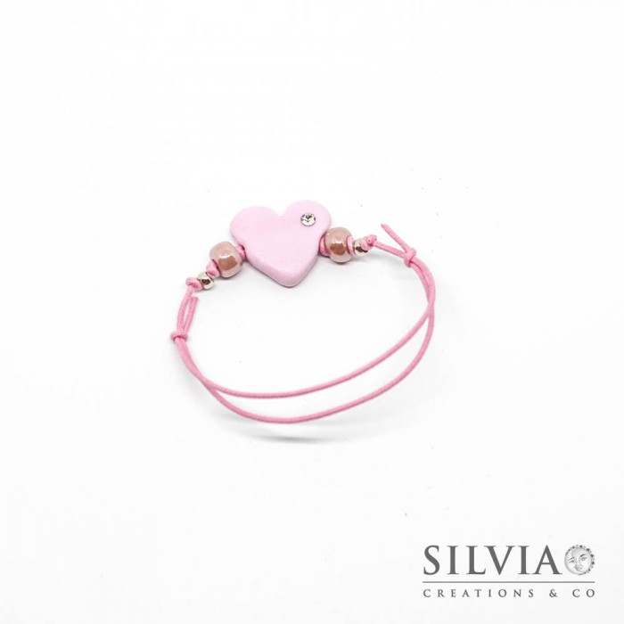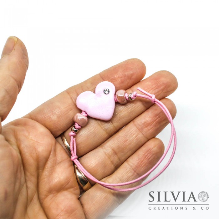 Ho realizzato questo bracciale con un ciondolo in fimo fatto a mano e del cordino cerato. Il ciondolo misura circa 22 mm ed è a forma di cuore rosa con cabochon Swarovski da 3 mm. Questo è fissato ad un cordino di cotone cerato rosa, nel quale ho infilato due perline rosa da 8 mm e 2 perline distanziatrici argento in ottone da 4 mm. Facendo scorrere i due nodi è possibile regolare la lunghezza del bracciale da un minimo di 15 cm ad un massimo di 26 cm.
