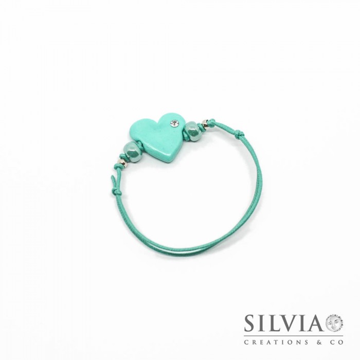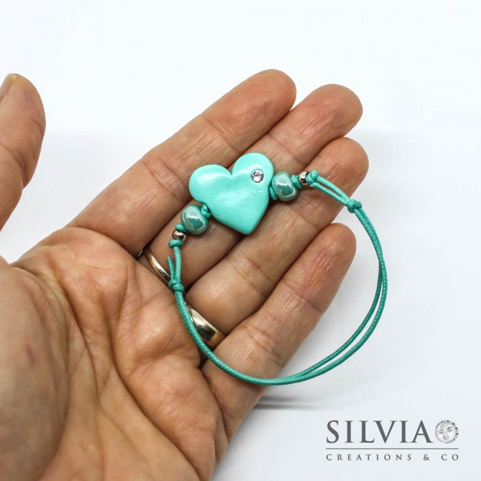 Ho realizzato questo bracciale con un ciondolo in fimo fatto a mano e del cordino cerato. Il ciondolo misura circa 22 mm ed è a forma di cuore azzurro acqua con cabochon Swarovski da 3 mm. Questo è fissato ad un cordino di cotone cerato azzurro, nel quale ho infilato due perline azzurre da 6 mm e 2 perline distanziatrici argento in ottone da 4 mm. Facendo scorrere i due nodi è possibile regolare la lunghezza del bracciale da un minimo di 15 cm ad un massimo di 26 cm.