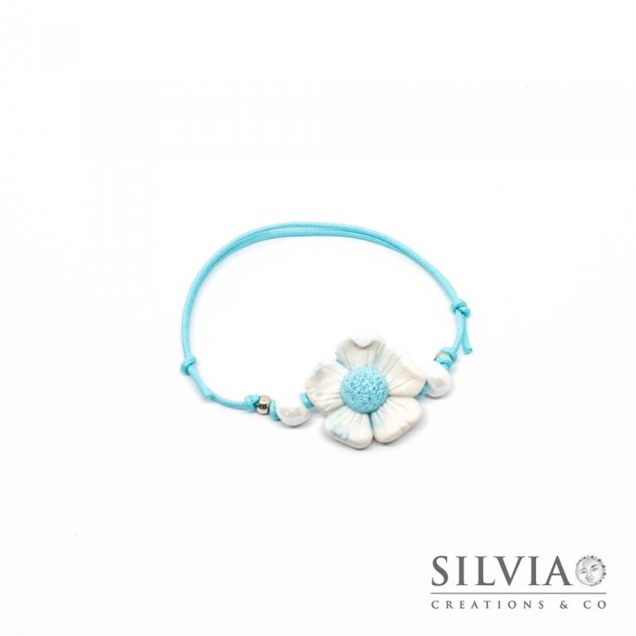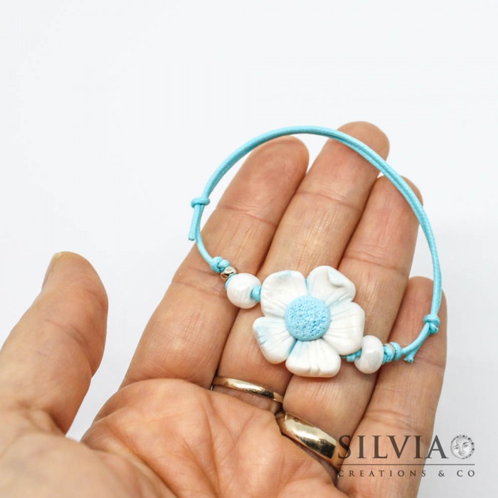 Ho realizzato questo bracciale con un ciondolo in fimo fatto a mano e del cordino cerato. Il ciondolo misura circa 22 mm ed è a forma di fiore azzurro e bianco. Questo è fissato ad un cordino di cotone cerato color azzurro, nel quale ho infilato due perline bianche e 2 perline distanziatrici argento in ottone da 4 mm. Facendo scorrere i due nodi è possibile regolare la lunghezza del bracciale da un minimo di 15 cm ad un massimo di 26 cm.