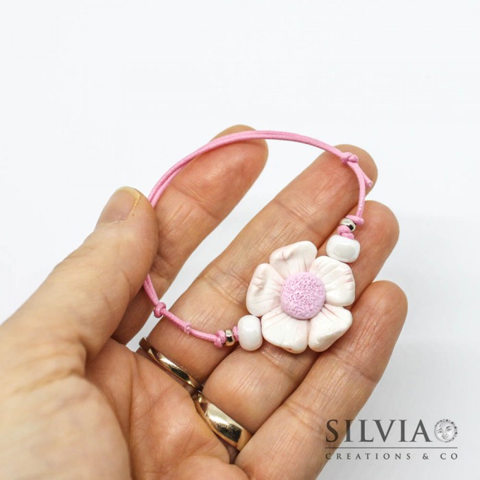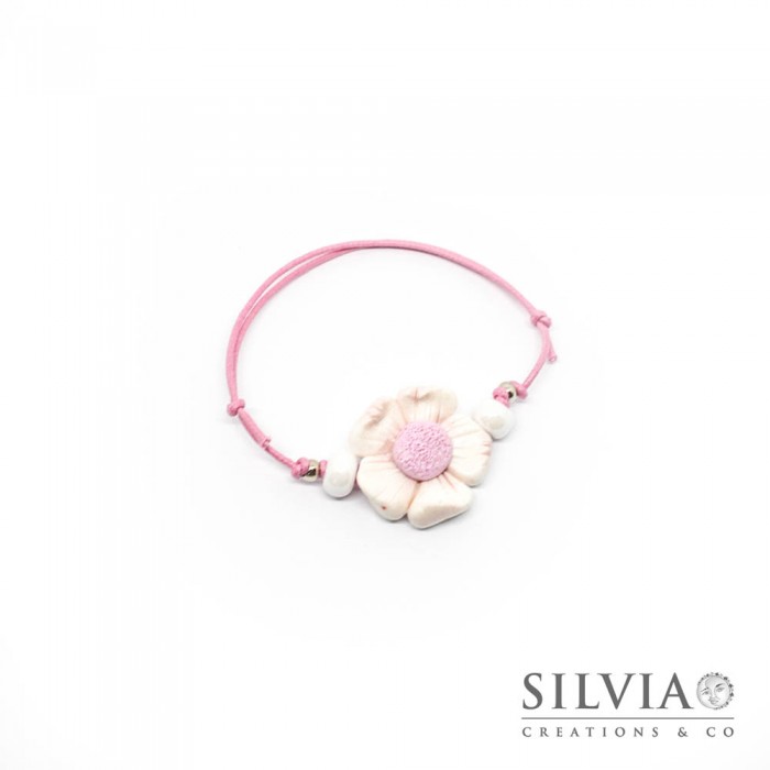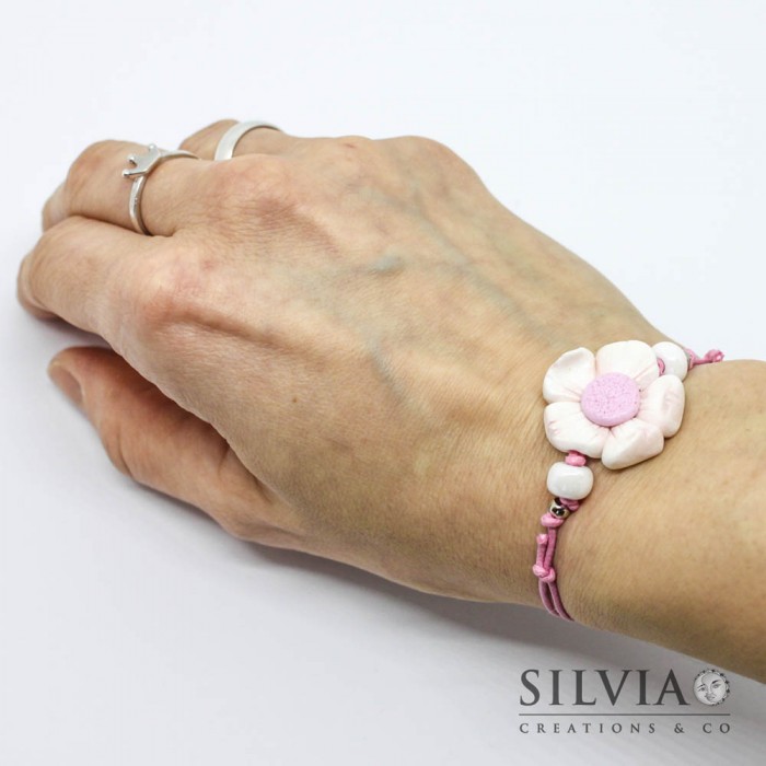 Ho realizzato questo bracciale con un ciondolo in fimo fatto a mano e del cordino cerato. Il ciondolo misura circa 22 mm ed è a forma di fiore rosa e bianco. Questo è fissato ad un cordino di cotone cerato color rosa, nel quale ho infilato due perline bianche e 2 perline distanziatrici argento in ottone da 4 mm. Facendo scorrere i due nodi è possibile regolare la lunghezza del bracciale da un minimo di 15 cm ad un massimo di 26 cm.