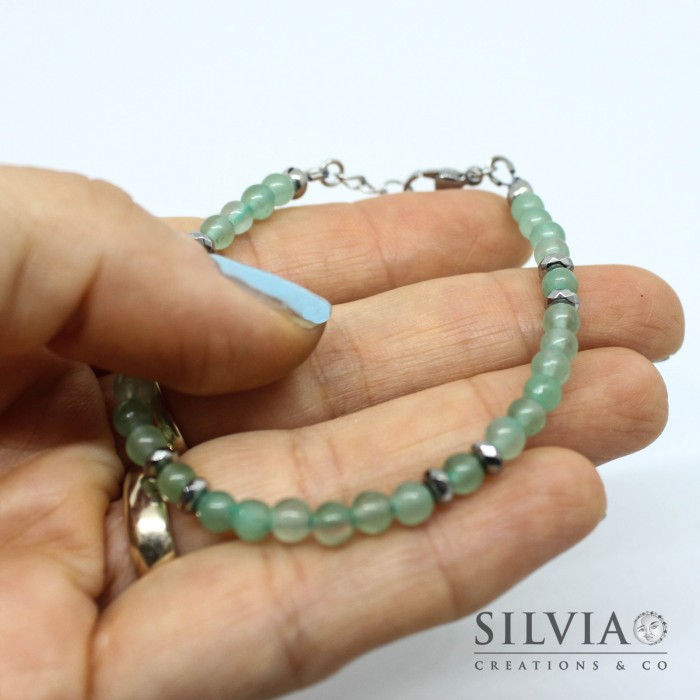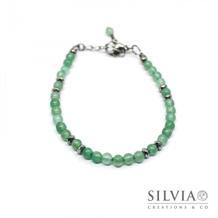 Ho realizzato questo bracciale con delle perle di avventurina verde da 4 mm, intervallate da rondelle sfaccettate di ematite sintetica. Le perle verdi sono trasparenti, il colore non è pieno.