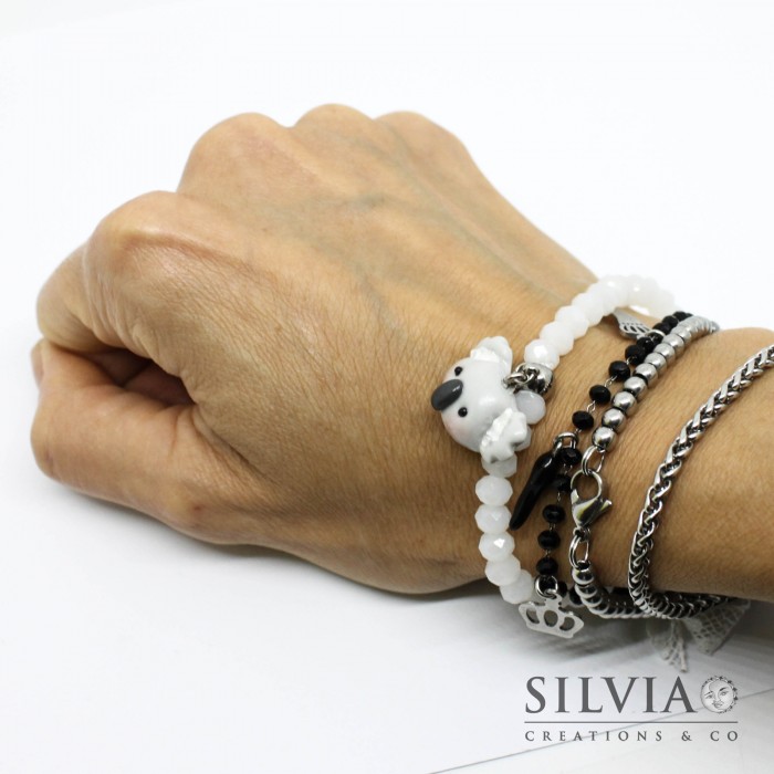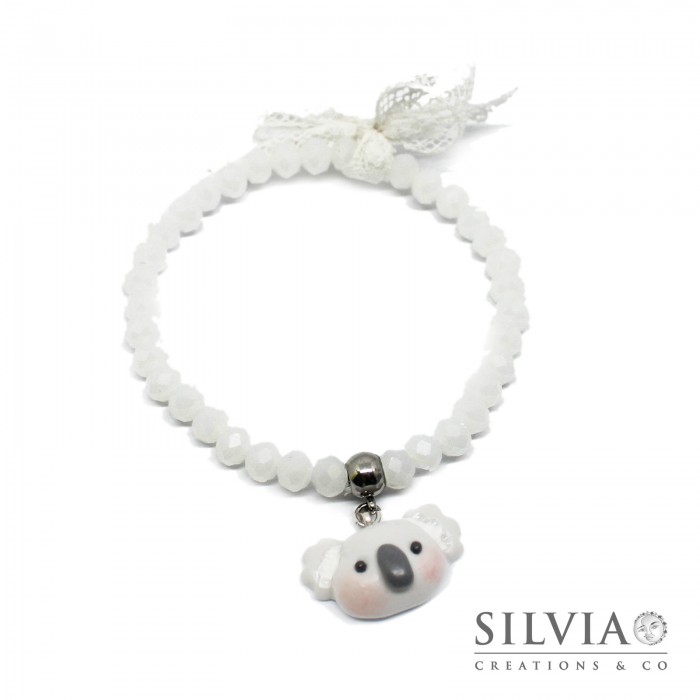 Per tutti gli amanti dei cuccioli ho realizzato questo bracciale con un ciondolo fatto a mano in fimo e dei cristalli. Il ciondolo misura circa 20x15 mm ed è a forma di musetto di koala. Questo è fissato al bracciale elastico composto da cristalli a rondella color bianco alabastro della misura di 4x6 mm ed il bracciale ha una circonferenza di 18,5 cm circa.