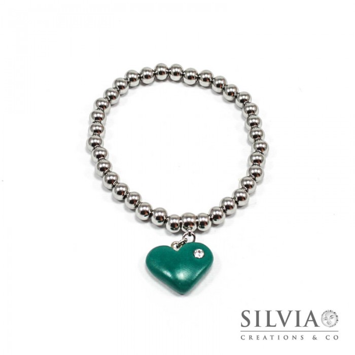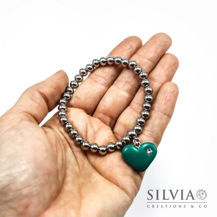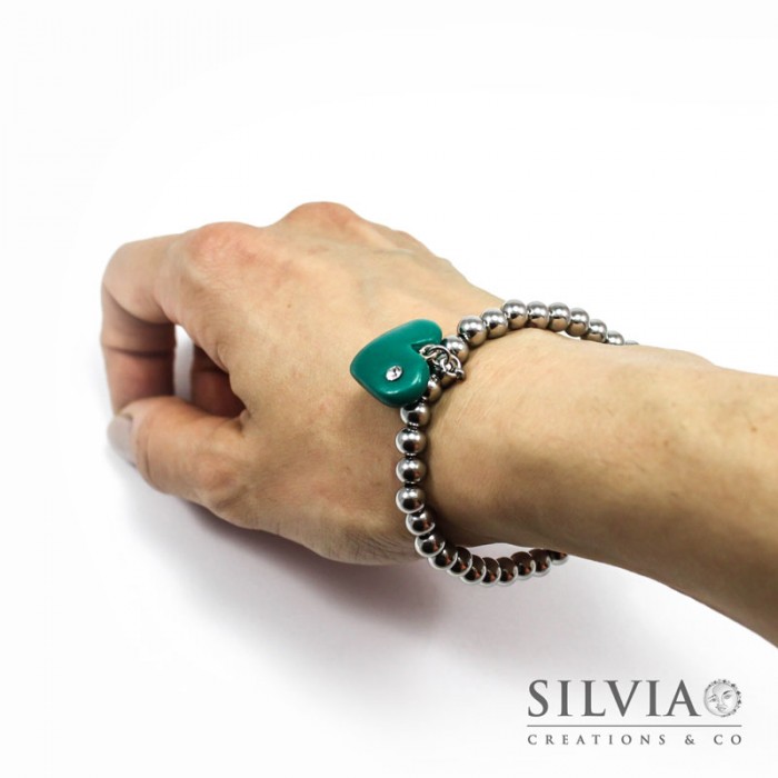 Bracciale perle acciaio con cuore verde smeraldo e strass