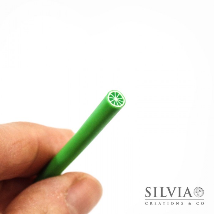 Canes in pasta polimerica a forma di lime 5x50 mm. Queste canne sono ideali per decorare dolcetti in miniatura realizzati con paste polimeriche (es. fimo). Possono essere utilizzate per la nail art o per lo scrapbooking. Si possono tagliare della misura desiderata con un cutter.