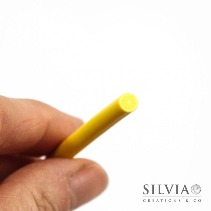 Canes in pasta polimerica a forma di limone 5x50 mm. Queste canne sono ideali per decorare dolcetti in miniatura realizzati con paste polimeriche (es. fimo). Possono essere utilizzate per la nail art o per lo scrapbooking. Si possono tagliare della misura desiderata con un cutter.