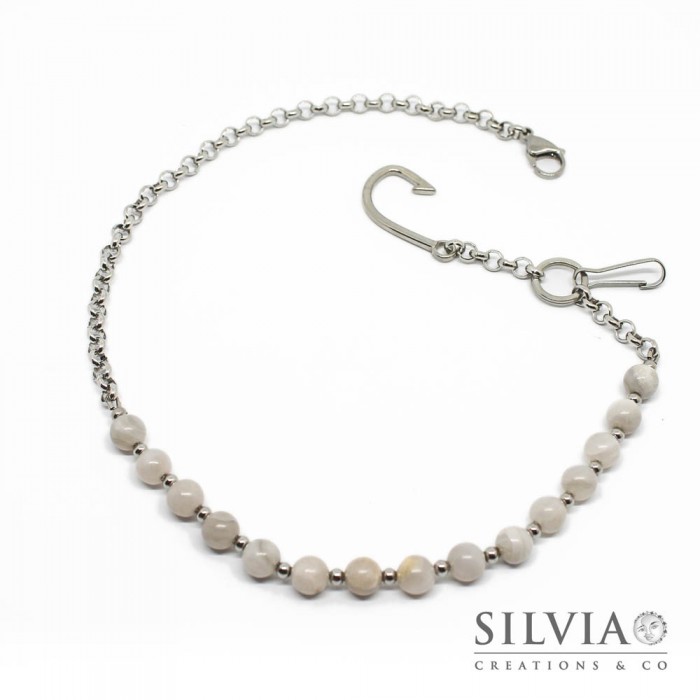 agata bianca, delle perle in acciaio, una catena in acciaio e delle chiusure