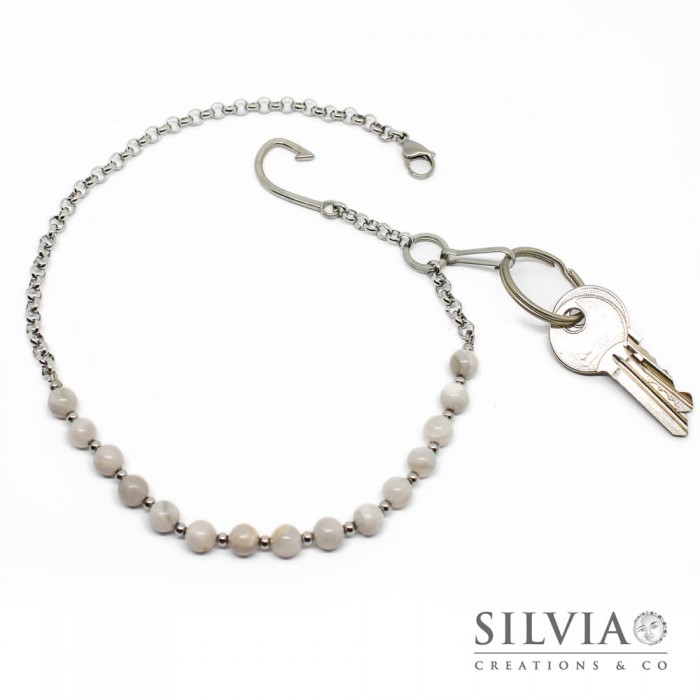 Catena portachiavi da uomo per pantaloni con perle di agata bianca da 8 mm