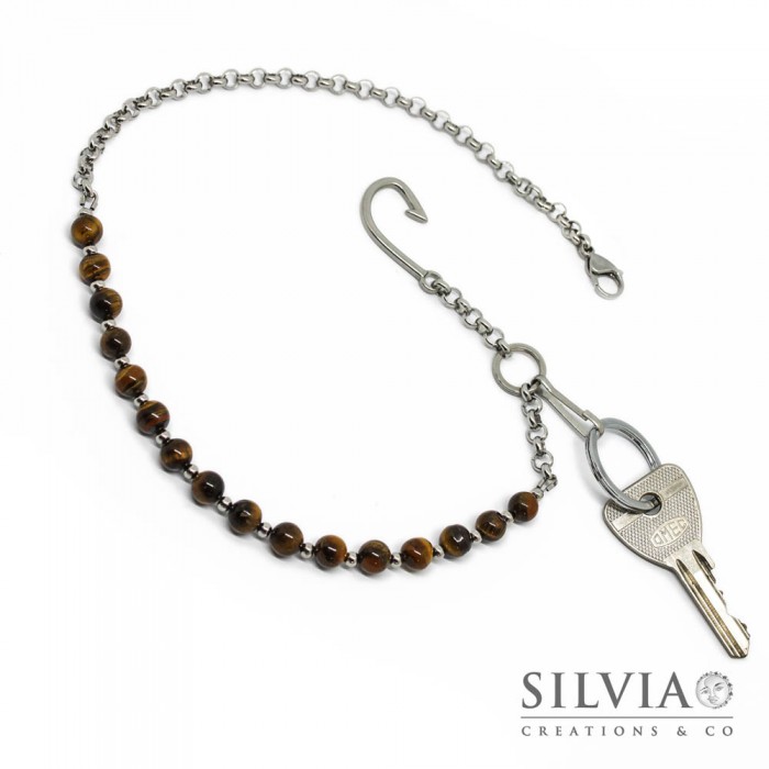 Catena portachiavi da uomo per pantaloni con perle di occhio di tigre da 8 mm