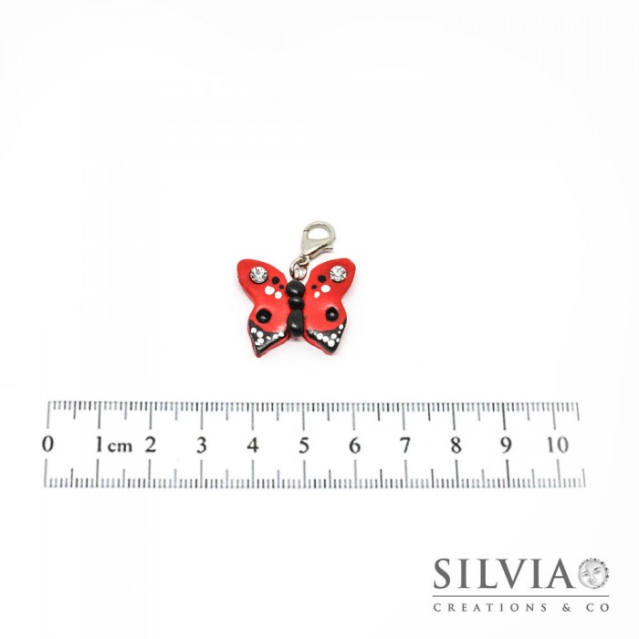 forma di farfalla con le ali rosse e nere decorate con puntini bianchi e neri e due strass incastonati nella parte superiore delle due ali. Il