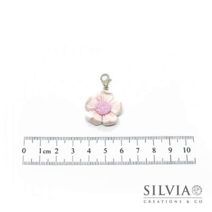 forma di fiore color bianco e rosa. Il soggetto è fissato ad un moschettone