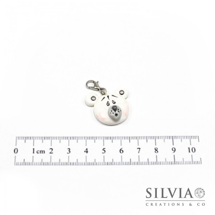 a forma di testa di orso color bianco e grigio. Il soggetto è fissato ad un